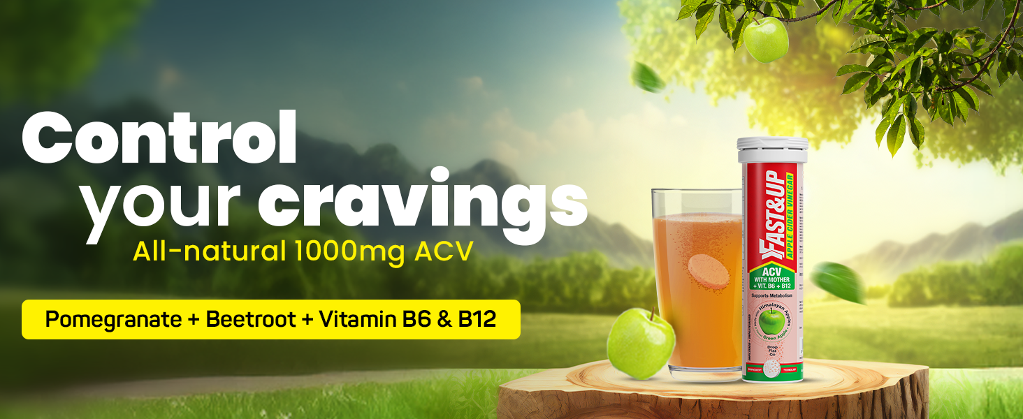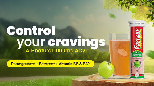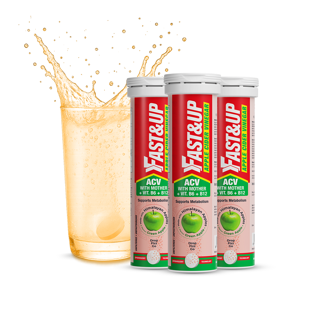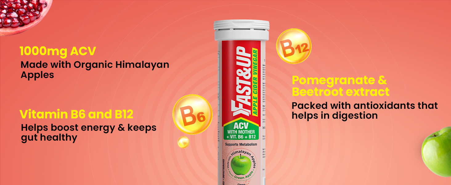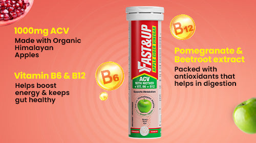 Fast&Up Apple Cider Vinegar is made with organic Himalayan apples is 100% natural & Unfiltered Apple Cider Vinegar. It contains the goodness of “Mother” with a fast- acting effervescent formula that helps in weight management. Fast&Up Apple Cider Vinegar contains Vit. B6 and B12 which help in fat mobilization and metabolism. It also contains Pomegranate and Beetroot extract packed with antioxidants that help maintain a healthy gut. Fast&Up Apple Cider Vinegar has no added sugar, is gluten-free and completely safe for Teeth enamel.