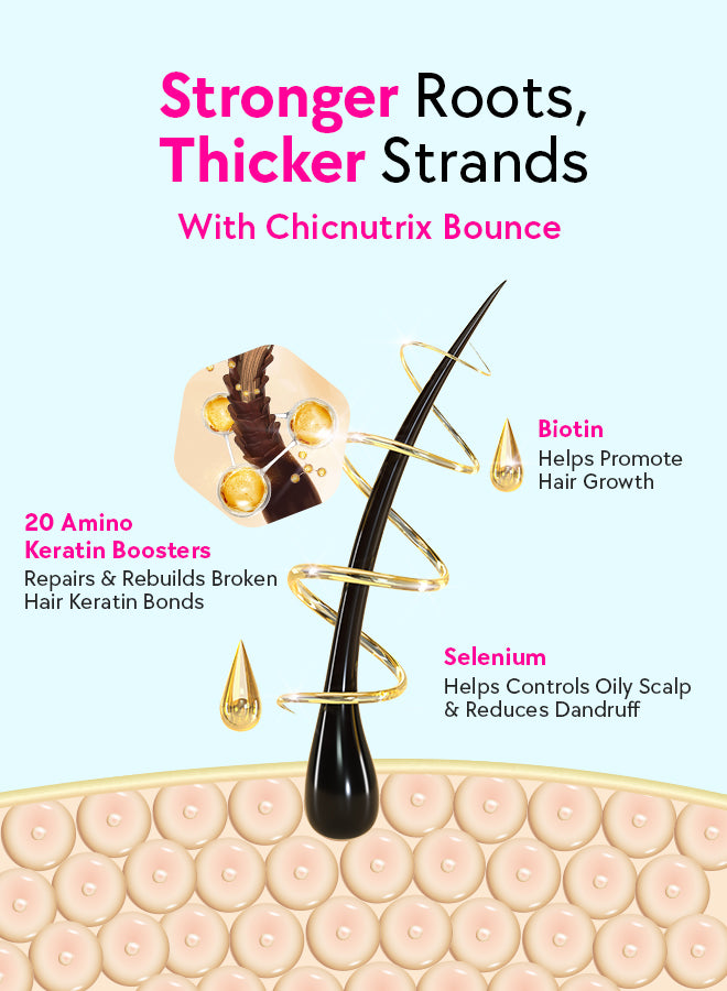 Are you struggling with hair fall, thinning, or lifeless hair? Chicnutrix Bounce is your answer to getting strong, healthy, and voluminous hair! This uniquely formulated hair regrowth supplement has the ingredient combination of Biotin, Selenium, and a Hair Recovery Complex (HRC) of 20 Amino Acids to help nourish your scalp while strengthen your hair from within.