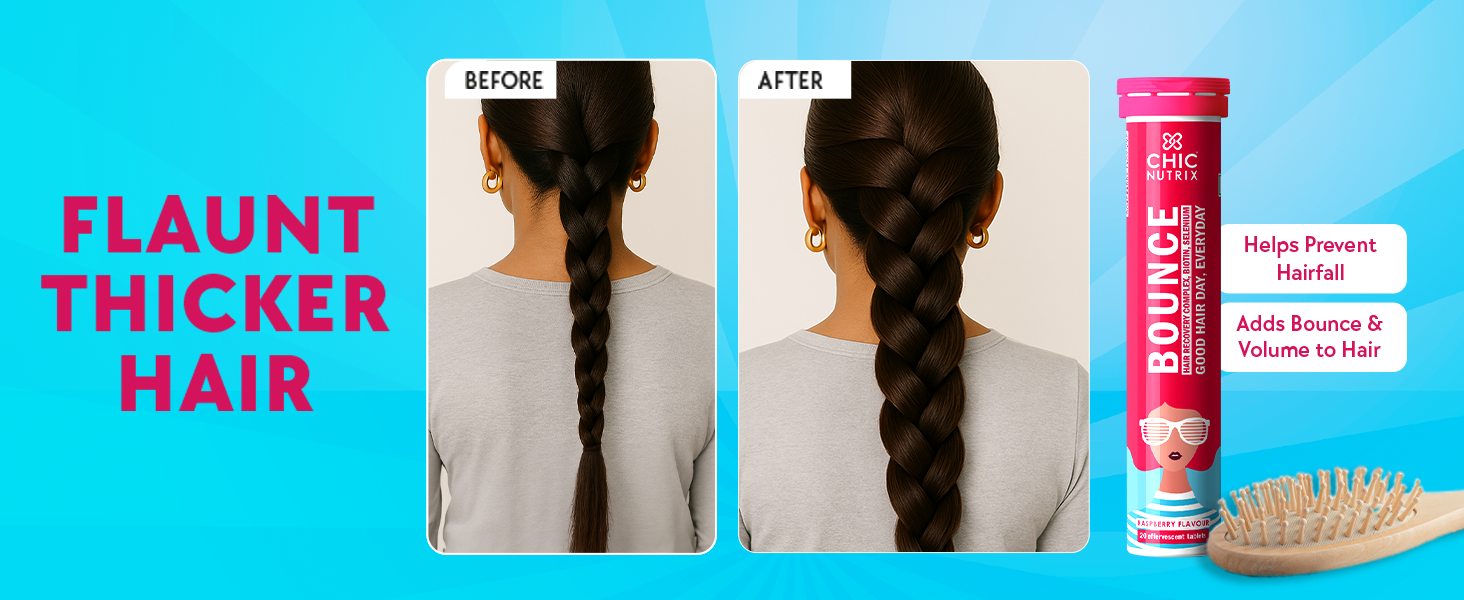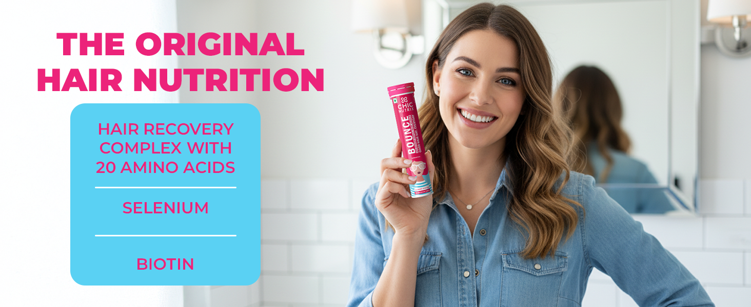 Are you struggling with hair fall, thinning, or lifeless hair? Chicnutrix Bounce is your answer to getting strong, healthy, and voluminous hair! This uniquely formulated hair regrowth supplement has the ingredient combination of Biotin, Selenium, and a Hair Recovery Complex (HRC) of 20 Amino Acids to help nourish your scalp while strengthen your hair from within.
