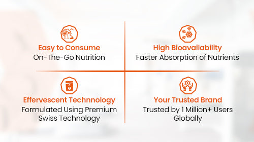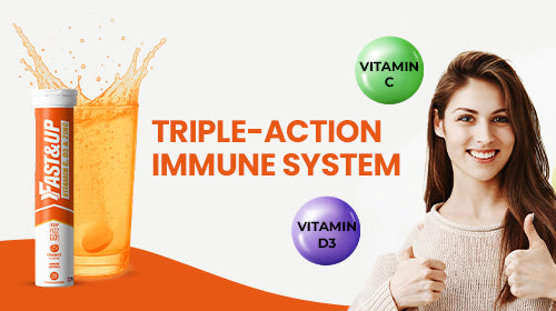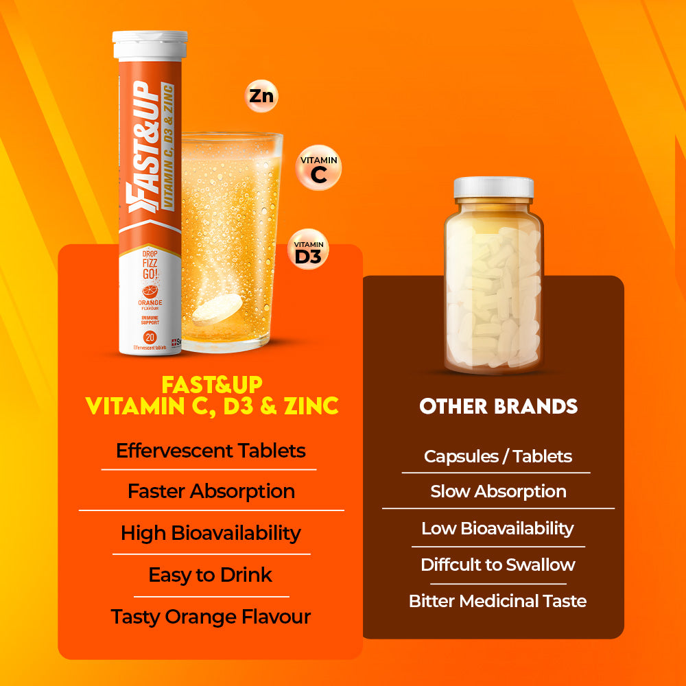 Fast&Up CDZ supplement is formulated with Swiss Effervescent Technology, providing a complete mix of powerful vitamins and minerals such as Vitamin C, D3, and Zinc. The triple power protection from 1000 mg Vitamin C, 2000 IU Vitamin D3, and 10 mg Elemental Zinc supports the immune system. Vitamin C, as Ascorbic acid, is a strong antioxidant and protects cells from oxidative damage. Vitamin D3 is biologically active and regulates immune responses. The essential mineral Zinc, present in its elemental form, contributes to the production and functioning of immune cells. Fast&Up CDZ protects from harmful bacteria, viruses, pathogens, and allergens. It is manufactured with premium quality Swiss Effervescent Technology to help offer faster absorption and high bioavailability of nutrients. It also aids in hydration, is gentle on the stomach, and is beneficial for people who have difficulty swallowing tablets or capsules. It is advisable not to use the product on an empty stomach.