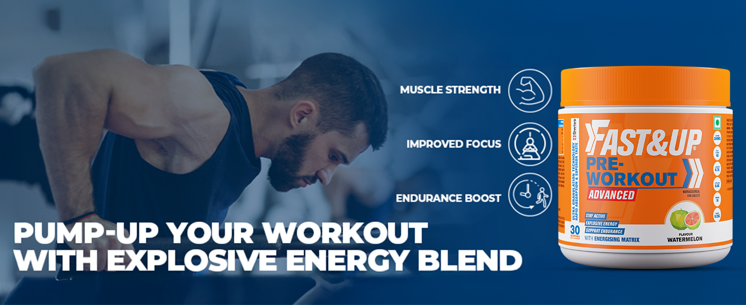 Fast&Up Pre-Workout is a pre-workout supplement made up of three performance-enhancing blends that assist to boost muscle power and strength, increase energy and concentration, reduce muscle fatigue, and fueling athletic performance.Packed with key ingredients like caffeine, beta-alanine, and electrolytes, it helps enhance physical performance and delay fatigue. Fast&Up Pre-Workout supplements are designed to push performance boundaries with blends including Energizing Matrix, Alertness Matrix, and Pump Matrix. Fast&Up Pre-Workout is ideal for athletes and fitness enthusiasts aiming to maximize their training sessions and achieve their goals.