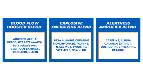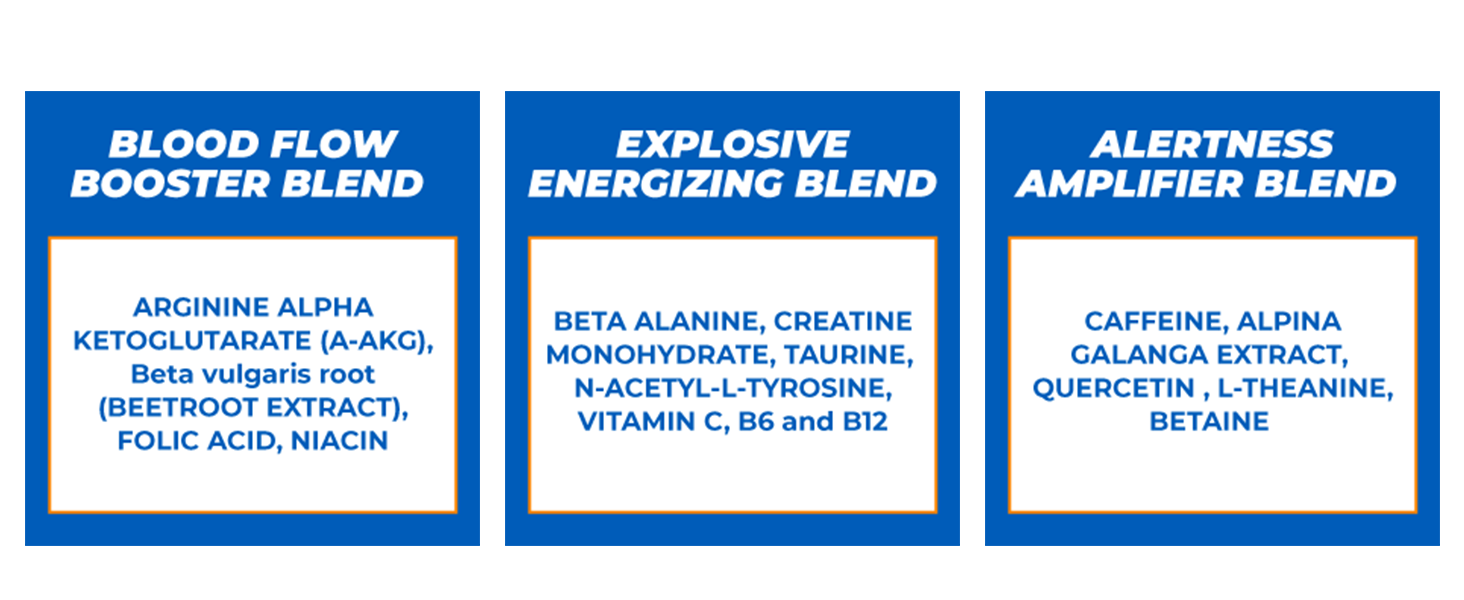 Energizing Matrix: This blend consists of ingredients which helps increase muscle energy, endurance and performance. Alertness matrix: This blend helps increase focus, alertness while preventing crash of stimulating effects. Pump matrix: This blend helps increase blood flow to the muscles with increased oxygen availability, stamina, endurance and power workout outputs to help you give more than your best in the training regime.